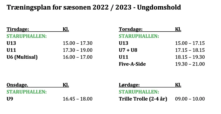 Tirsdag - Staruphallen kl. 17.30 - 18.45.